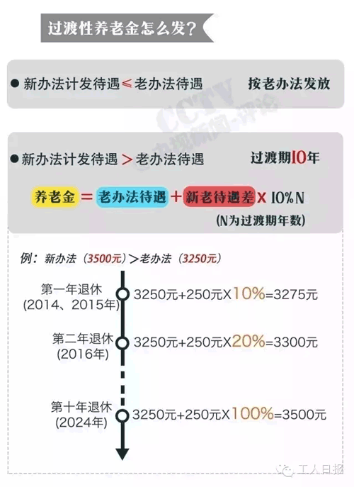 對于2014年10月1日前(簡稱改革前,下同)參加工作、改革后退休的“中人”設立10年過渡期,過渡期內實行新老待遇計發(fā)辦法對比,保底限高。過渡期結束后退休的人員執(zhí)行新辦法。